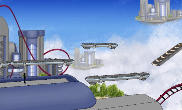 Originally, Rising Resort started out as another level at the beginning of Rooftop Renegade’s development, Cloudy Carnival. We thought it would be fun to create an amusement park level, with the Rooftops of Cyber City being replaced by a decommissioned roller coaster with scaffolding. After hitting a few walls with design consistency, the idea was eventually reworked into a paradise, high above the clouds with a roller coaster system weaving between the buildings.Rising Resort was designed with a few ideas in mind: mimic the surroundings of the upper atmosphere, create an organic/mechanic beach resort and show off the wealth and luxury of Cyber City’s upper class. The giant floating platforms and their buildings’ silhouettes replicate the giant clouds they’re surrounded by. The floating platforms themselves are like flying tropical islands in both shape and colour, with the infinite sky posing as the paradise’s ocean. I also wanted to convey that this paradise is fake; it disguises itself as organic and non-intrusive but it’s still flying pieces of metal and glass covered in superficial plant life.