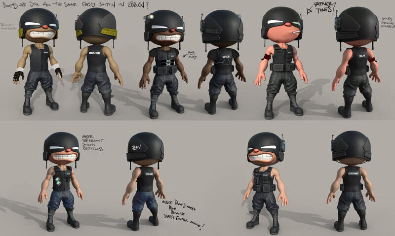 Some of the things that I wanted to convey with these characters were the paramilitary aspects. Globacorp is a big evil corporation that has hired these goons to enforce their whims on the world of Rooftop Renegade; so, a lot of the designs we re based on special tactics police forces and military outfits and equipment. These decisions followed on with some of the other elements like their vehicle which is basically a flying SWAT van.Next up, some design decisions and discussions lead to the idea of multiple gunners.Back to the cheekily 3D rendered concept page for paint overs.
