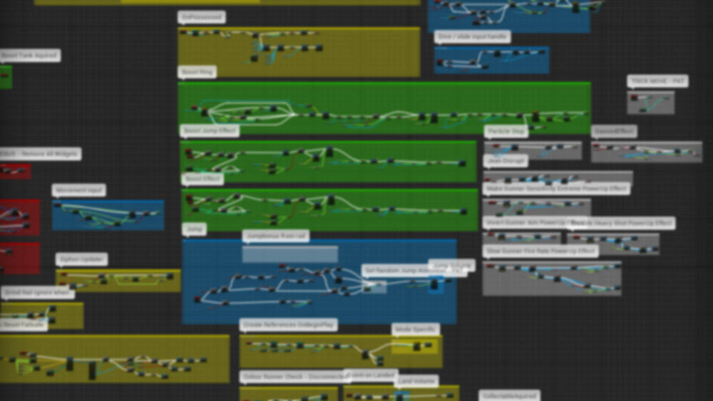 I’ve recently implemented a powerup system that had been on the design backburner for a while, a quick prototype that covered everything that needs to be there to experiment with and decide if it should be pursued. I started by identifying what I would need access to. For this test it was character speed and temporal recharge meter. From working on the character early on I knew where these functions were held. Simple enough. Next, a trigger. Already in the game we have shards that when collected, trigger the character to increase the temporal meter. Awesome, now I have the functions I need to mess with, and a blueprint that can already speak to them. From there I can add a simple function, tweak the colours on the shard blueprint, and place it in a few procedural level chunks for testing.