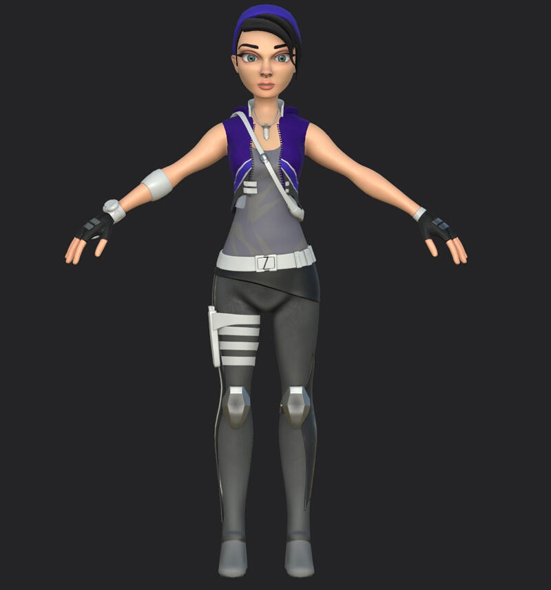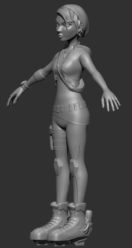Moving into 3D, the final sculpt has ended up looking like this; taking the cues I planned out in the sketch I set to modelling and refining all the details to line up with the concept. Most of my time here was spent on her face as that was one of the major things I wanted to get right; however, retaining the same feel and personality while restructuring all the proportions was an interesting hurdle to jump.