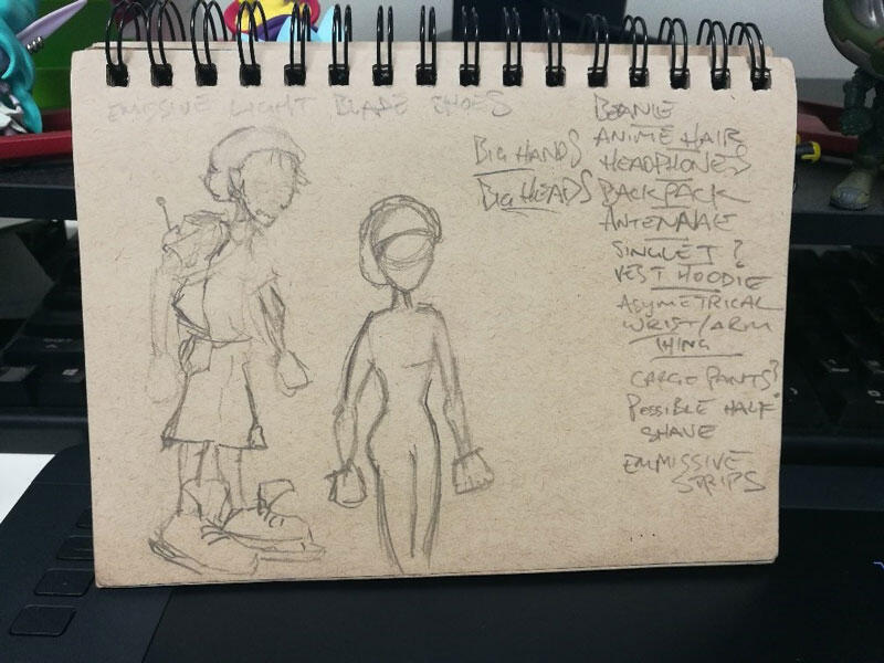 For a little bit of history; the first design sketch was done in about 10 minutes after brainstorming the design and ideals of our main character at the Global Game Jam, back in 2018. Coming up with the key features was the quickest way to get my ideas down.