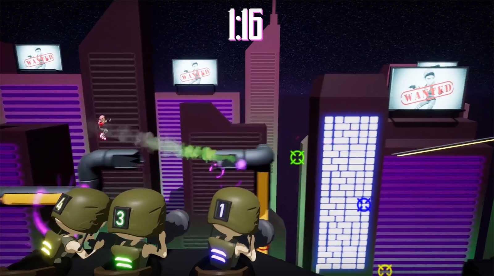 We managed to grab a great office at GamePlus Adelaide, and over the next few months experimented with various directions to take the idea. This included a mobile endless runner, and an online multiplayer experience. Quite by accident we found a single player challenge mode was just as exciting as the multiplayer (Pat needed a way to test without distracting the rest of the team). Rooftop Renegade pivoted to a challenge-based platformer, with the party mode still included for local fun.