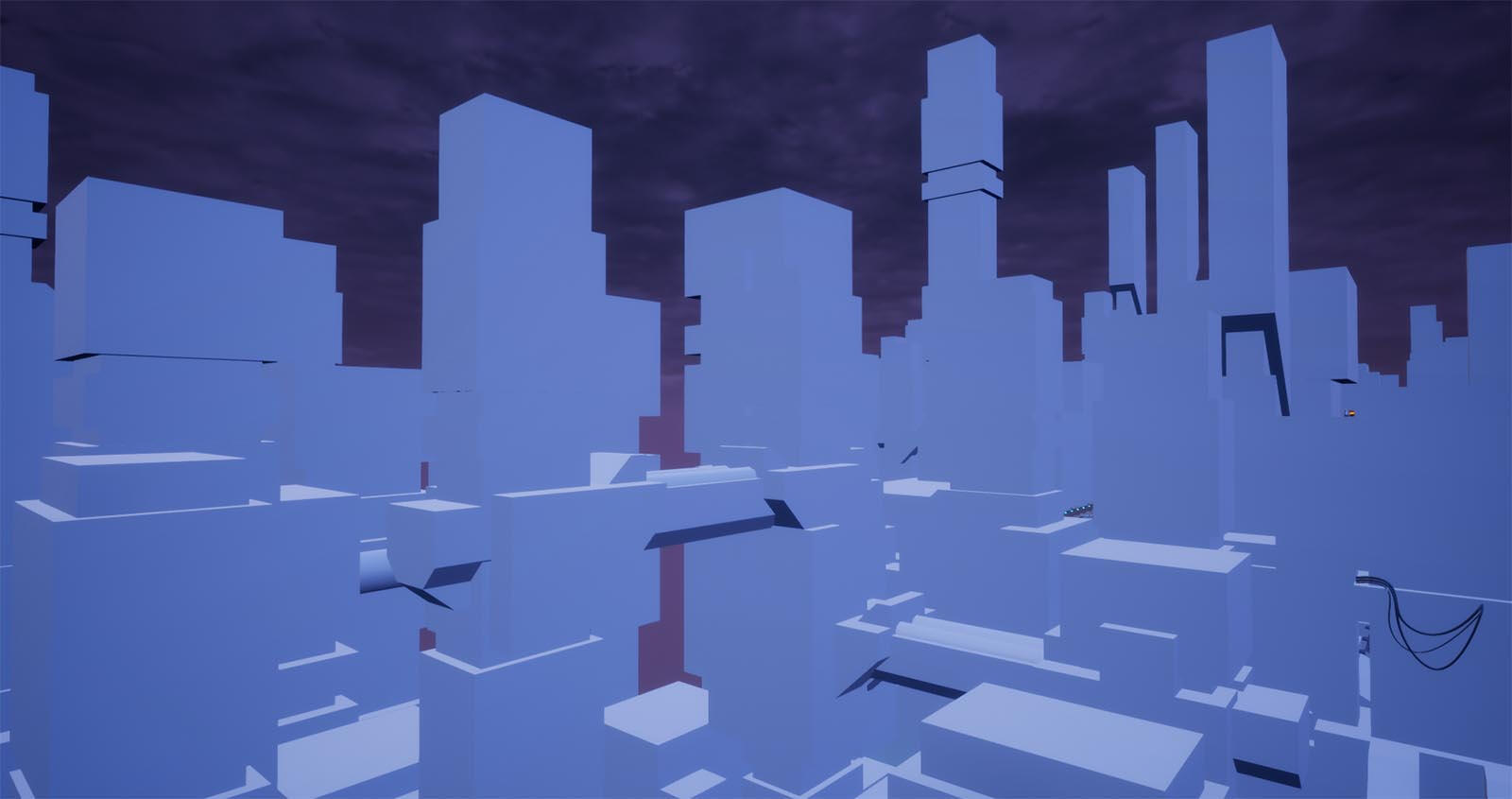 For creating the environment and assets for what would become ‘Rooftop Renegade’ the first step was creating the modular platforms pieces for our Renegade to move along. Pat would be placing all the foreground assets (platforms, hazards, grind rails) himself so there had to be as little confusion as possible between the two developers. We worked with a strict UE4 unit measurement, so all Pat had to do was turn on snapping and move the pieces along the track.Texturing was kept to a minimum, there just wasn’t enough time to model, UV and texture – not with my limited skillset and Maya’s then-limited UV toolset. With the aid of a plugin, we adapted a cell-shaded look which means the 3D assets could just have a plain material applied and wouldn’t look out of place. As the background buildings wouldn’t be UV’d windows were decals projected onto the side of the buildings. Decals were also used to emulate the green ‘fog’ in the lower part of the city (as of this article, that decal is still in the current city along with added exponential height fog.)
