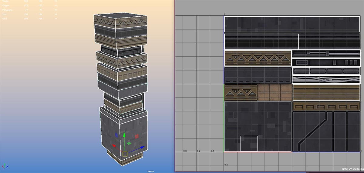 One of the many buildings in Cyber City laid out on a ‘trim sheet’(right). This technique allows for many unique texture layouts.