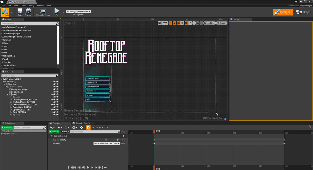 For creating the environment and assets for what would become ‘Rooftop Renegade’ the first step was creating the modular platforms pieces for our Renegade to move along. Pat would be placing all the foreground assets (platforms, hazards, grind rails) himself so there had to be as little confusion as possible between the two developers. We worked with a strict UE4 unit measurement, so all Pat had to do was turn on snapping and move the pieces along the track.Texturing was kept to a minimum, there just wasn’t enough time to model, UV and texture – not with my limited skillset and Maya’s then-limited UV toolset. With the aid of a plugin, we adapted a cell-shaded look which means the 3D assets could just have a plain material applied and wouldn’t look out of place. As the background buildings wouldn’t be UV’d windows were decals projected onto the side of the buildings. Decals were also used to emulate the green ‘fog’ in the lower part of the city (as of this article, that decal is still in the current city along with added exponential height fog.)